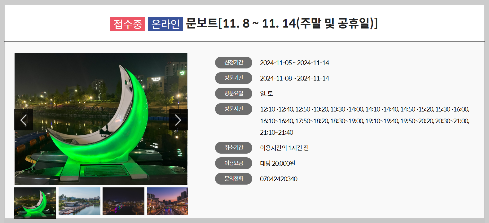 이용요금은 1대 기준으로 20,000원으로 대략 탑승시간은 30분입니다. 여름철에는 주말 저녁 예약은 힘들었는데 이제 날씨가 추워지기 시작하니 예약가능 시간대가 꽤 많이 보이네요.